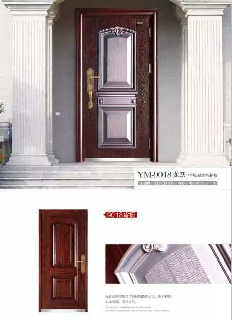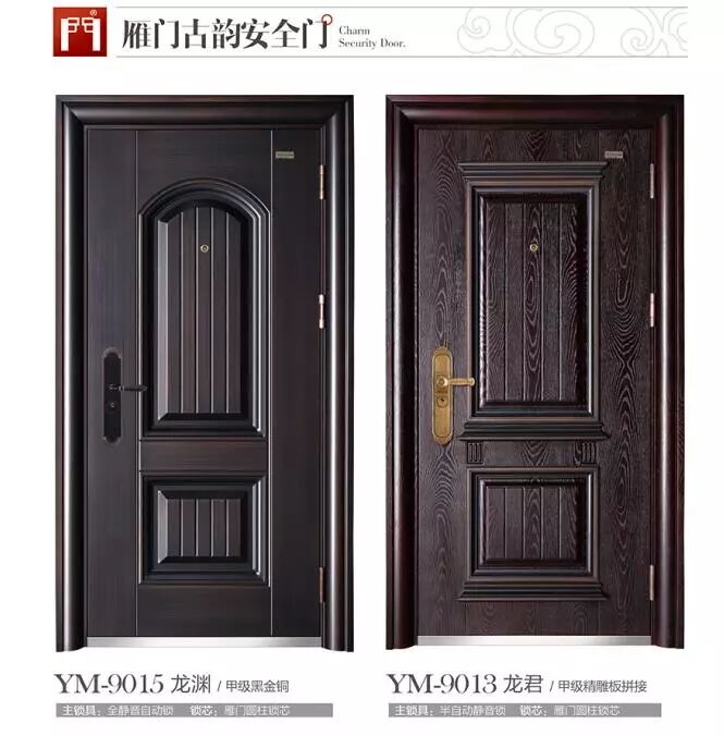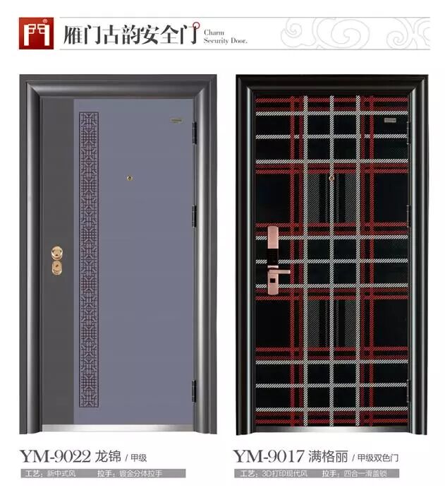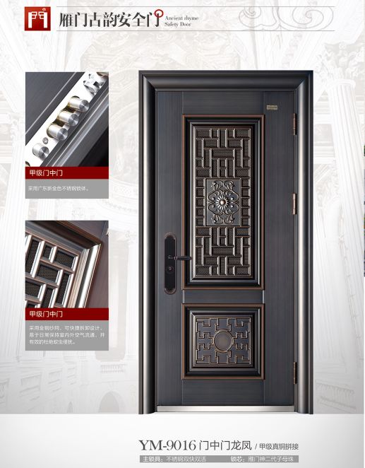 2018雁门古韵安全门系列。今年公司推出平板简约、铝板拼接、纯黑铜、3D打印、聚氨酯发泡,前钢后木等多个系列十多款新产品,继续为您的家人打造坚不可摧的安全之门,总有一款适合您的家庭!
