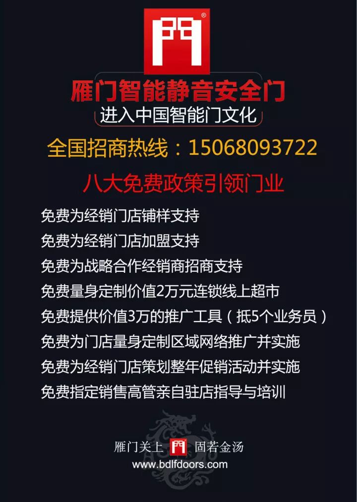 浙江龙川雁门八大免费加盟政策引领门业 龙川门业企业官网:www.longtrade.cn 加盟热线:15068093722